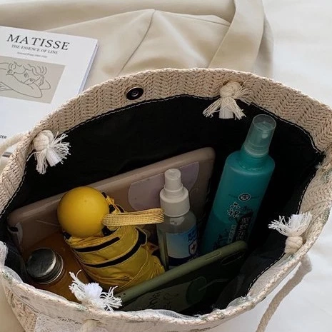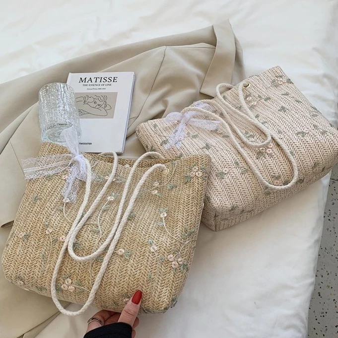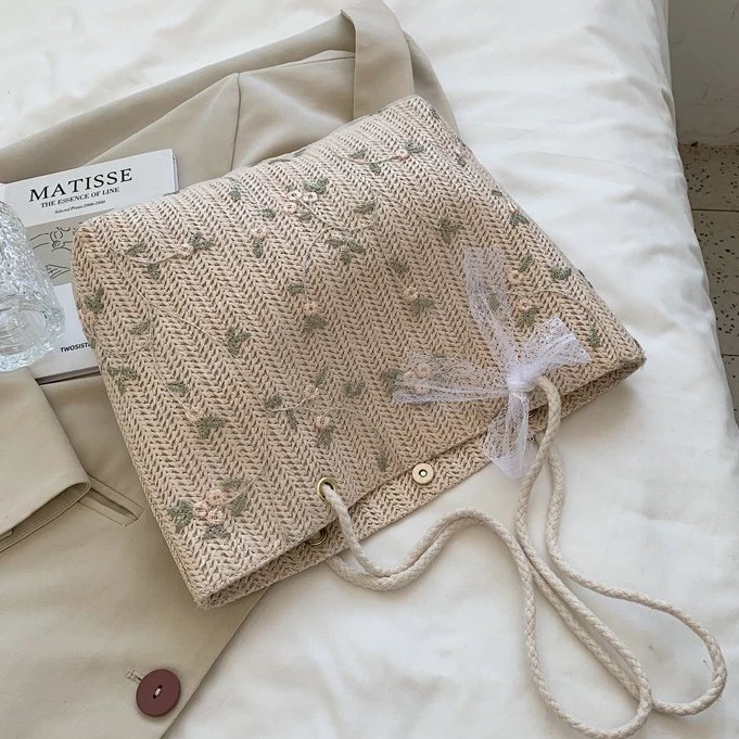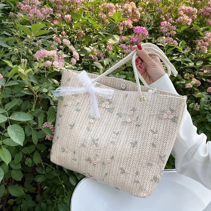 Túi cói phối ren tiểu thư cột nơ phong cách Hàn Quốc, Túi xách nữ