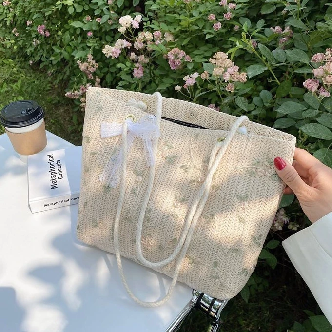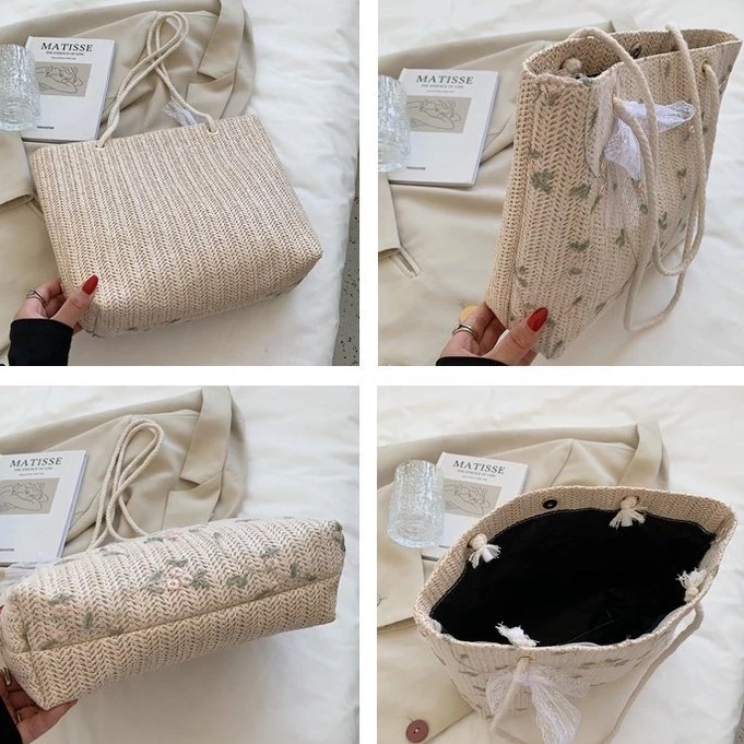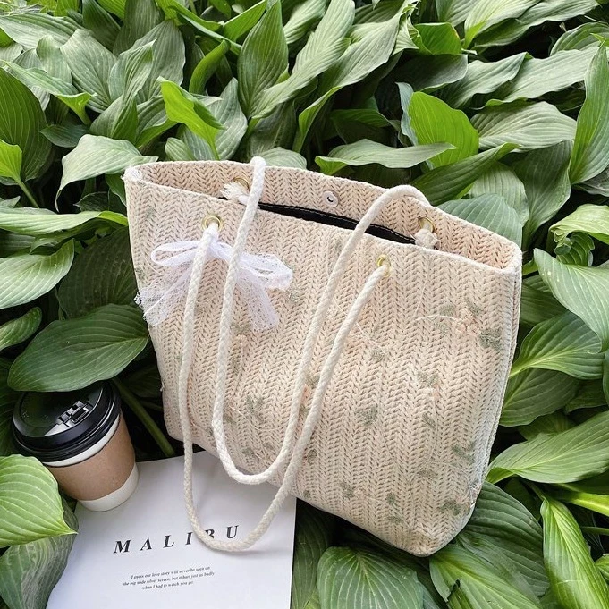 Túi cói phối ren tiểu thư cột nơ phong cách Hàn Quốc, Túi xách nữ